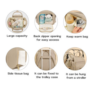 - Highlights: 13 well-sized pockets for storage and organization, roomy main section, two insulated milk bottle pockets, separate dry and wet sections, anti-theft back pocket, front and back openings for easy accessibility, key chain clip, D-rings for hands-free usability, adjustable 5-cm wide cushioned back straps.